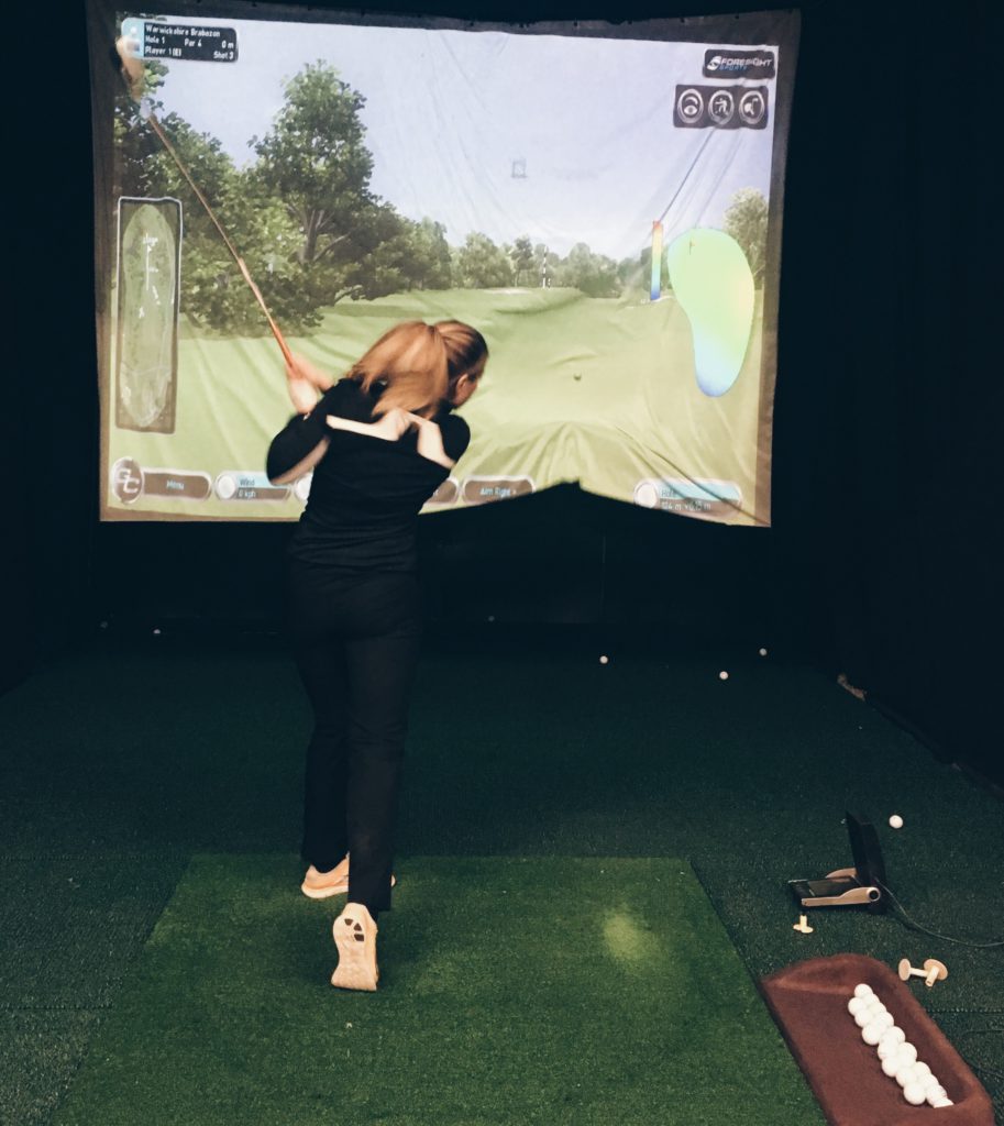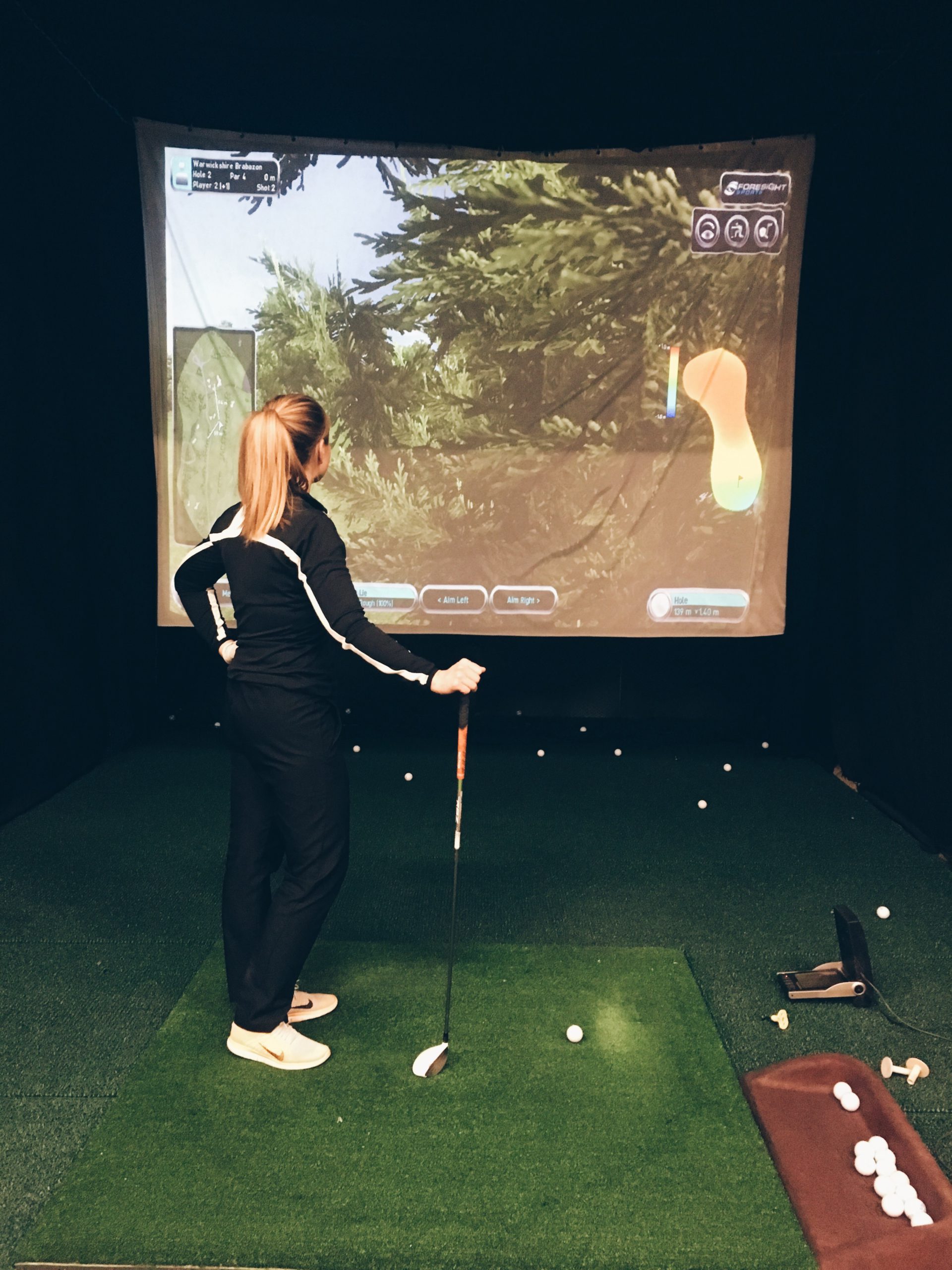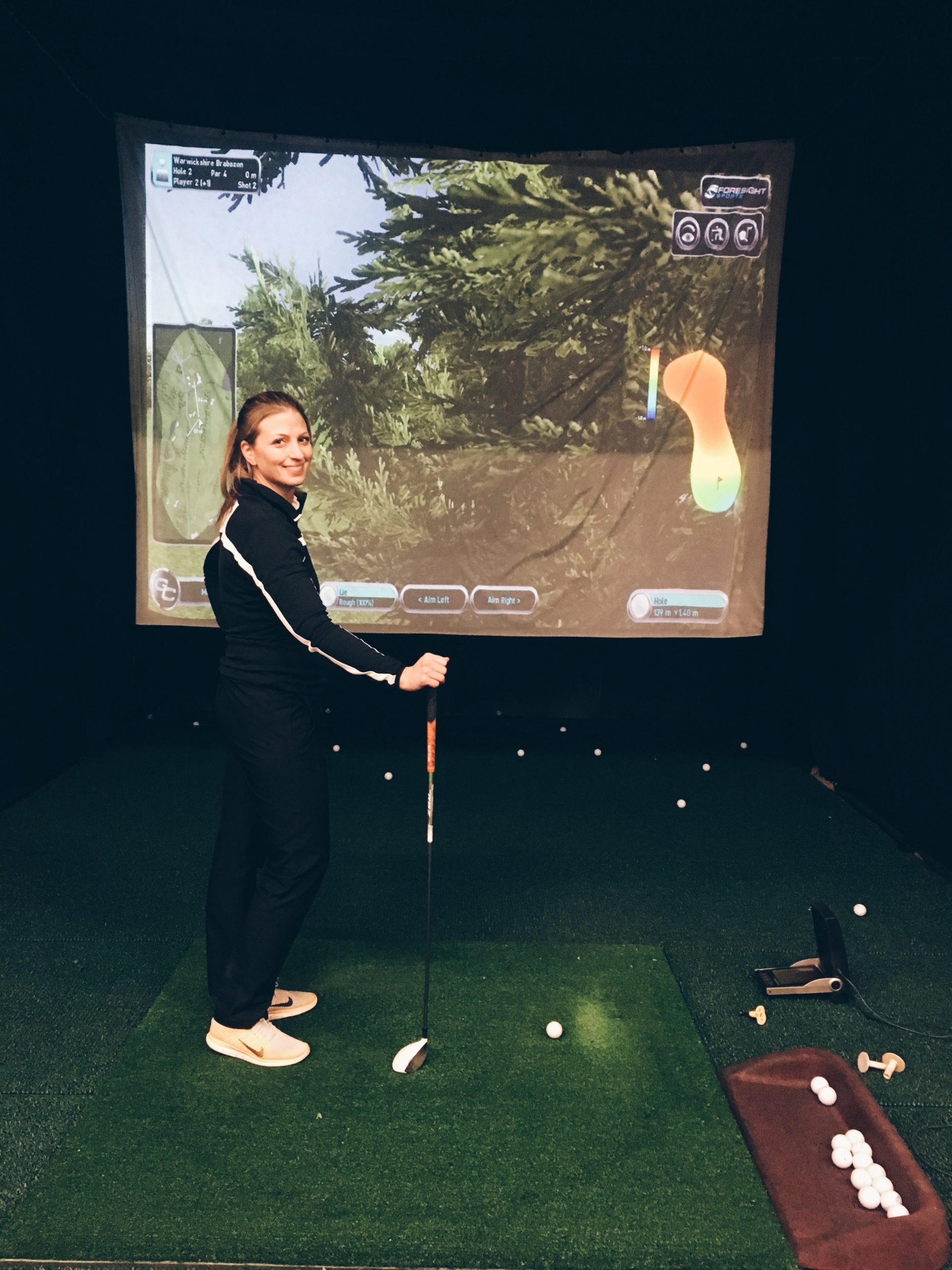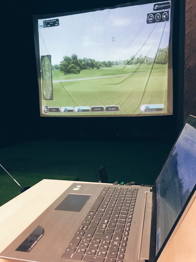Nimittäin kaikki se rentous ja rauhallisuus, joka on ollut läsnä talviharjoittelussa, oli kadonnut. Tunsin olevani jännittynyt ja puristavani mailaa, kun asetuin lyöntipaikalle mustalla lakanalla vuoraillun pienen tilan sisälle ja näin edessäni väylän kirkkaalla screenillä. En yhtäkkiä muistanut enää mitään siitä, mitä olin talvella harjoitellut. Lopputulos oli sen mukainen.