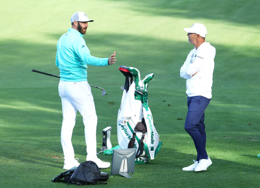 Dustin Johnsonin viimeisin voitto on peräisin vuoden 2020 Mastersista. Vieressä pelaajaa kuuntelee valmentaja Claude Harmon III. Kuva: Getty Images