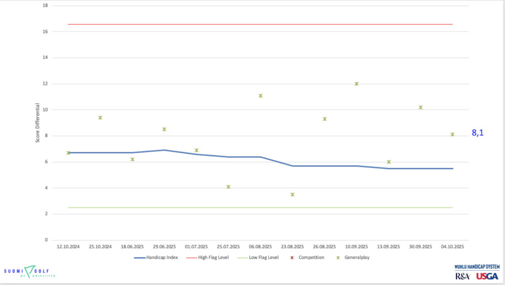 Kuin takuiksi Wikström näytti podcastin juontajille graafin heidän tasoituksensa kehittymisestä kuluvalla kaudella. Graafissa näkyvät vihreinä tasoituskierrosten tulokset ja punaisella kilpailuissa pelattujen tasoituskierrosten tulokset.